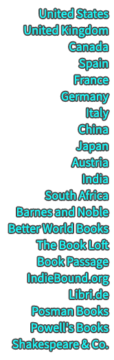 United States United Kingdom Canada Spain France Germany Italy China Japan Austria India South Africa Barnes and Noble Better World Books The Book Loft Book Passage IndieBound.org Libri.de Posman Books Powell's Books Shakespeare & Company Booksellers